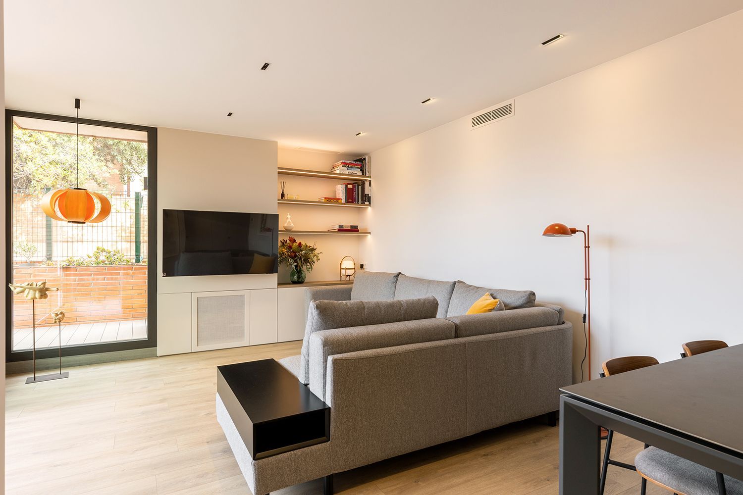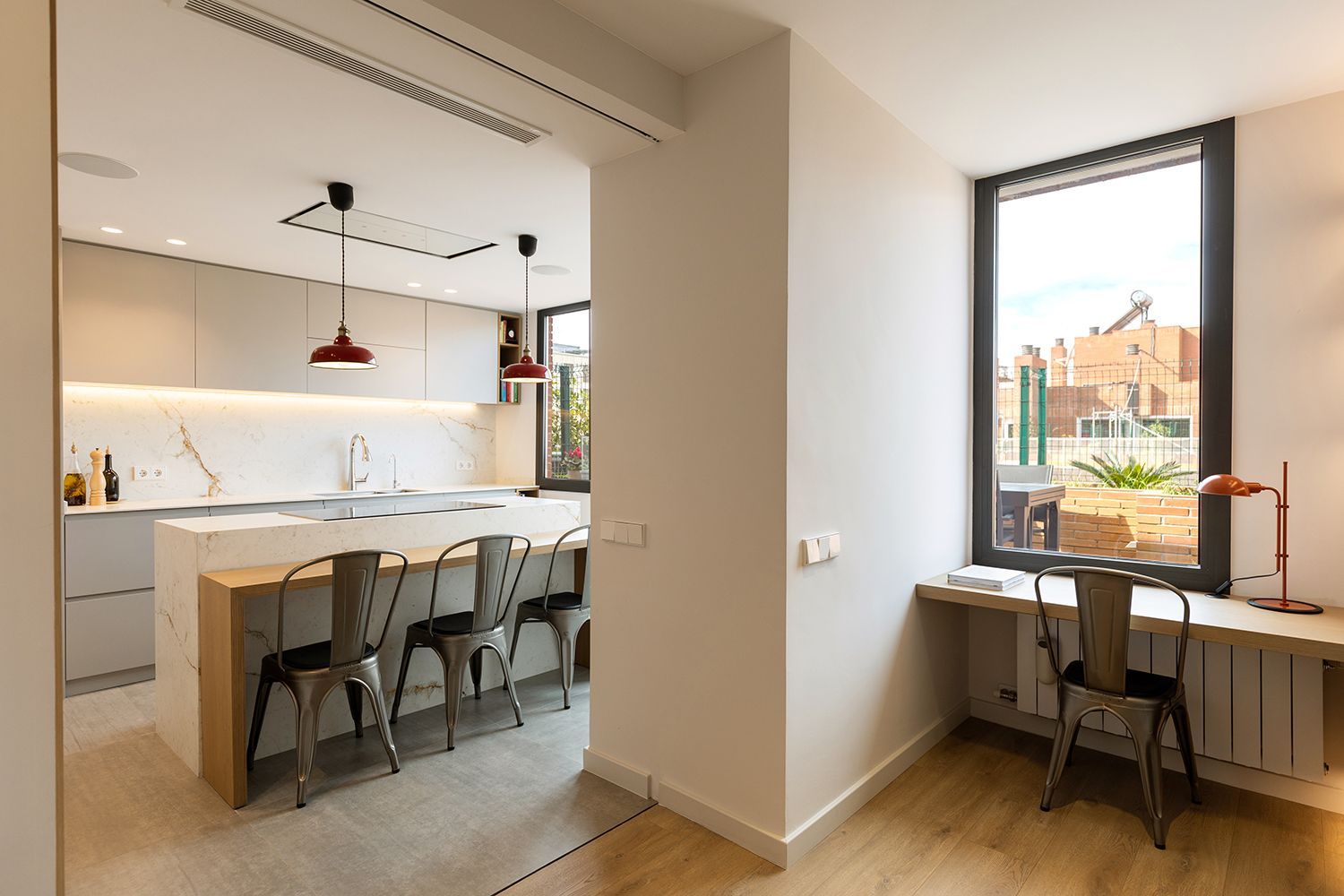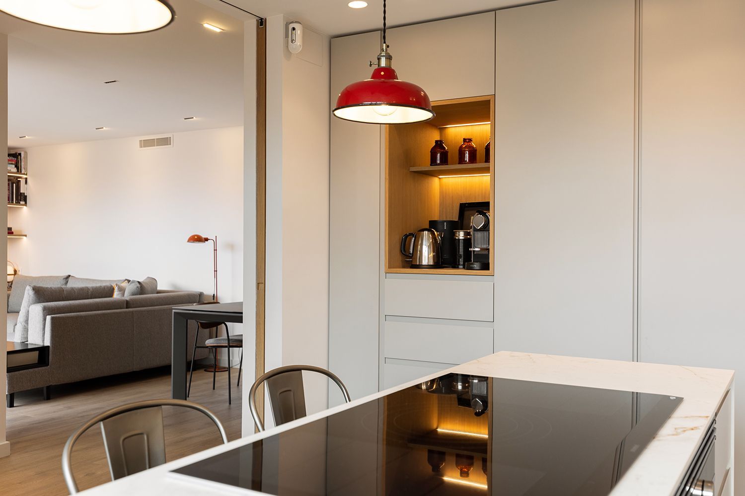 La sala de estar y el comedor eran un poco pequeños y tuvimos que ampliarlos. Para ello eliminamos un pequeño dormitorio contiguo a la sala y creamos un espacio intermedio abierto entre la sala y la cocina dónde se ubica un pequeño estudio y la bodega, ya que para los clientes era importante tener un espacio dedicado a los vinos.