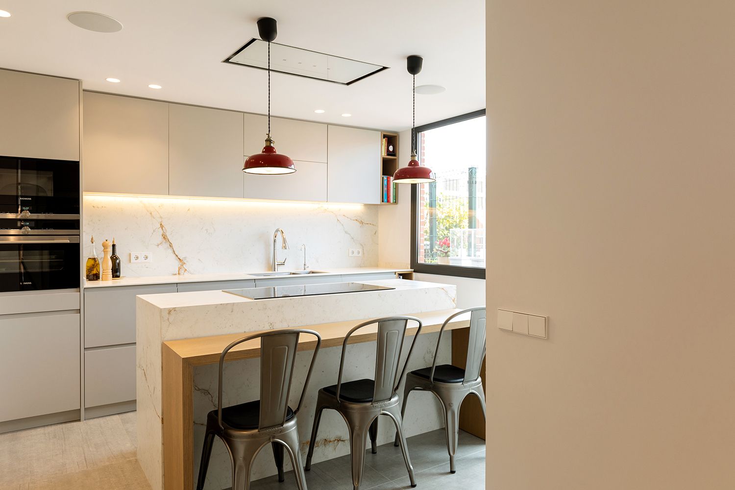 En el centro de la cocina está ubicada una isla con zona de cocción y una barra de madera contigua a ella. Los muebles de cocina son lacados en tono piedra y madera que combina con el resto del piso.