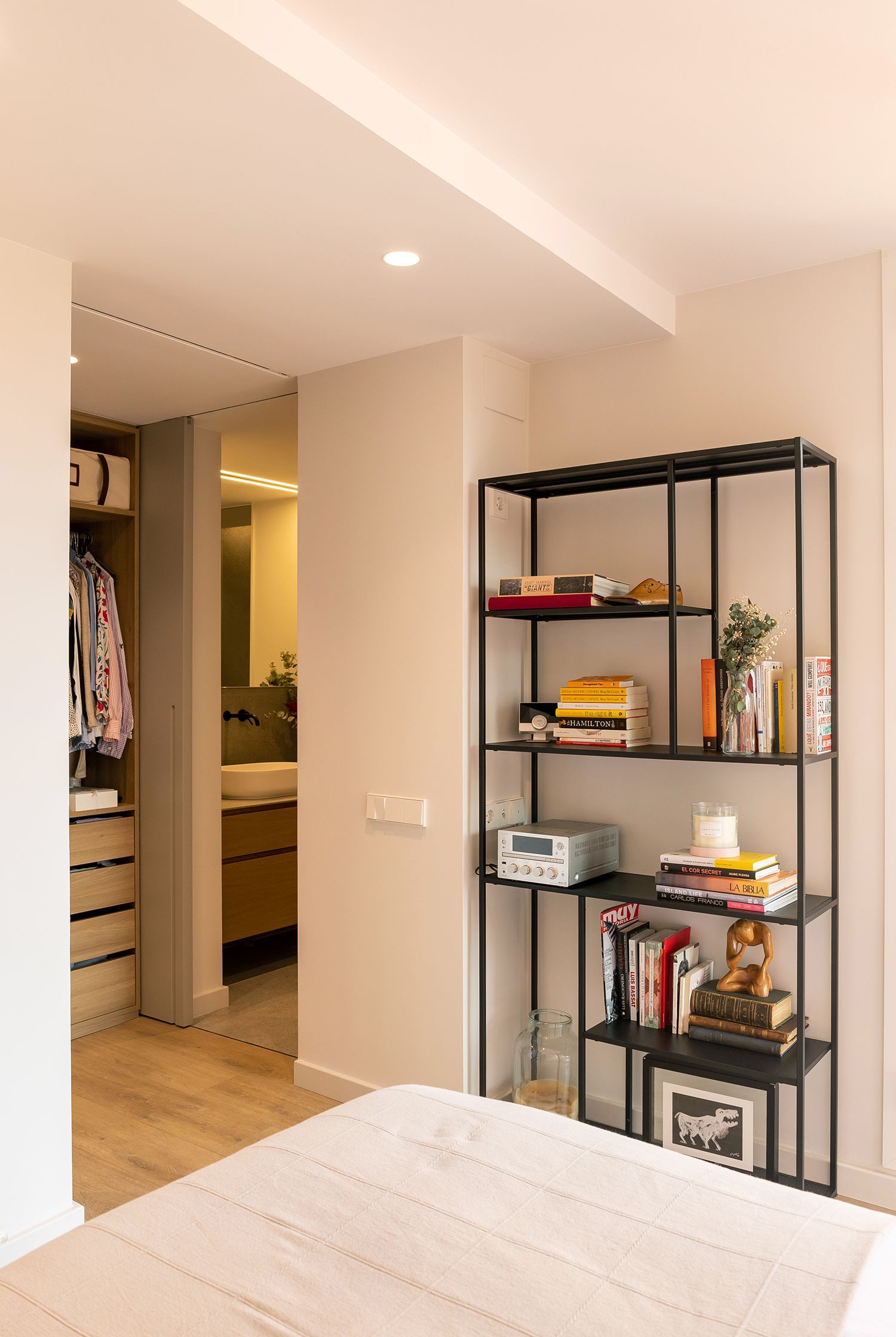 En el baño principal, que se accede por el vestidor, tiene la ducha totalmente cerrada con una mampara fija y una puerta de cristal para dar más amplitud al espacio. La encimera es del mismo material porcelánico que las paredes y tiene un lavamos sobre encimera de solid surface.